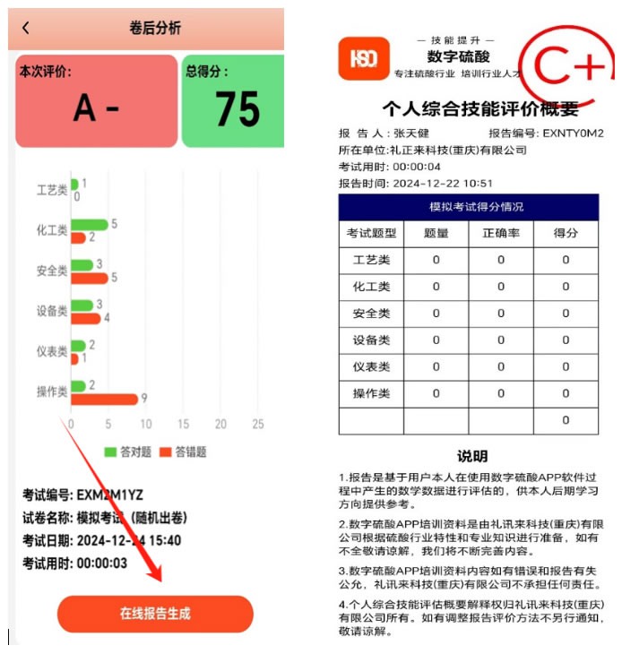在模擬考試中,我們采用系統(tǒng)隨機(jī)抽取試卷的方式,將測(cè)試題目類型分為單選、多選、判斷和填空,并要求員工在有限時(shí)間內(nèi)完成所有題目,最后提交試卷即可得出總分?jǐn)?shù)。在界面末端的 “在線報(bào)告生成中”,可以清晰的反應(yīng)員工個(gè)人對(duì)不同類型題目的答題情況,并生成員工“個(gè)人綜合技能評(píng)估表”。