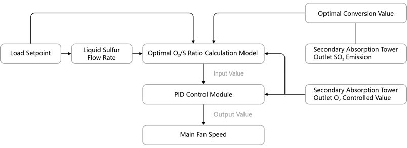 Sulfur acid making plant is the upstream device and energy supply of chemical enterprises, its production efficiency and cost control are directly related to the economic benefits of enterprises. In the process of sulfuric acid production, oxygen/sulfur directly affects the productivity, energy efficiency and stability of process parameters. At present, the manual control method used in sulfur acid making equipment is often difficult to accurately regulate the oxygen sulfur ratio, resulting in low production efficiency, high energy consumption and unstable process parameters, which brings safety to the equipment. Therefore, it is of great significance to explore and realize the automatic control scheme for the optimal oxygen/sulfur ratio of sulfur acid making plant to improve the operation efficiency, reduce the production cost and enhance the market competitiveness of enterprises.