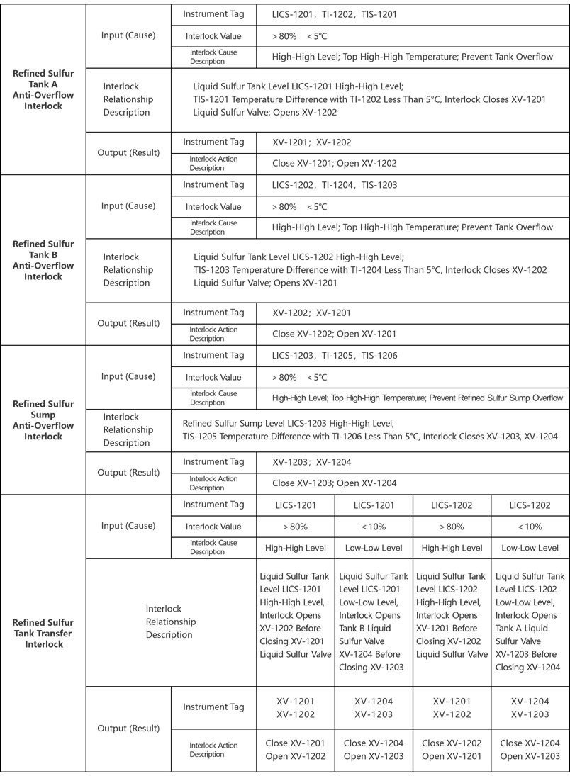 In order to ensure the stability of the supply of raw materials and the reliability of the refined sulfur tank, two large refined sulfur tanks are usually designed to store refined liquid sulfur. The capacity of the large sulfur tank is determined according to the size of the device and storage time, and the basic storage time should meet the consumption demand of 15 to 30 days. According to the storage time difference of fine sulfur, the large tank can also further precipitate impurities in liquid sulfur to the bottom of the tank through physical sedimentation, thereby reducing the ash content in the system. Therefore, it is very important to realize automatic filling of large sulfur tank and automatic control of liquid level of tank and tank. For this reason, we specially designed the automatic control scheme of large sulfur tank.