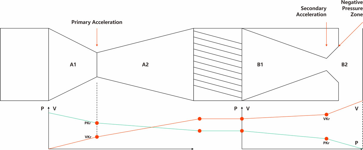 Liquid sulfur in the high efficiency nozzle runner does not produce along and local resistance, liquid sulfur into the nozzle total pressure P can be ignored in the nozzle runner pressure loss. As the liquid sulfur passes through the Laval nozzle, its pressure is reduced and the alkali salts dissolved in the liquid sulfur are resolved. Because there is no local resistance in the nozzle runner, no vortex flow will be formed, so there will be no particle collision to generate alkali salt nuclei. The alkali and salt particles resolved from the liquid sulfur are carried out of the nozzle under the action of high flow rate, which effectively avoids the problem of nozzle blockage.