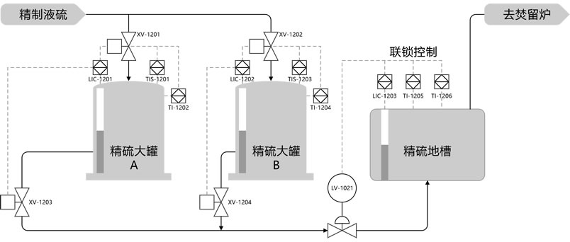 精硫作為裝置生產(chǎn)的原料,為確保原料供應(yīng)的穩(wěn)定性和精硫罐的可靠性,通常會(huì)設(shè)計(jì)兩個(gè)精硫大罐用于儲(chǔ)存精制液硫。精硫大罐的容量根據(jù)裝置規(guī)模和儲(chǔ)存時(shí)間確定,基本的儲(chǔ)存時(shí)間應(yīng)滿(mǎn)足15至30天的用量需求。根據(jù)精硫的儲(chǔ)存時(shí)間差,大罐還可以通過(guò)物理沉降的方式,使液硫中的雜質(zhì)進(jìn)一步沉淀至罐底,從而減少系統(tǒng)中的灰分含量。因此,實(shí)現(xiàn)精硫大罐的自動(dòng)倒罐和罐、槽液位的自動(dòng)控制顯得尤為重要。為此,我們專(zhuān)門(mén)設(shè)計(jì)了精硫大罐自動(dòng)控制方案。
