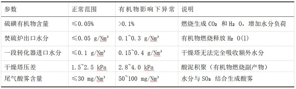 表1為有機物對參數(shù)影響對照表,實際生產(chǎn)中需控制硫磺中水分含量及酸度,水分過高會促進SO3轉(zhuǎn)化為酸霧,而酸度超標將加速設(shè)備腐蝕。