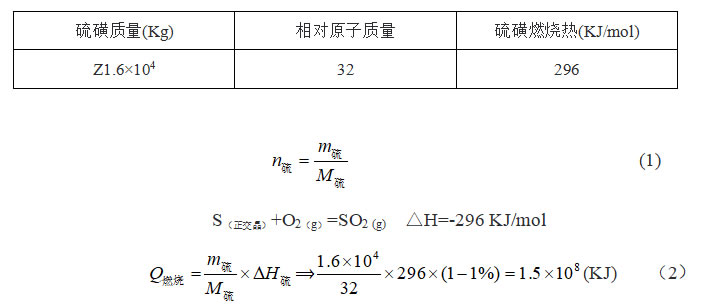 我們假設(shè)硫磺的總質(zhì)量為1.6×104 Kg,采用以定質(zhì)量求其物質(zhì)的量計(jì)算硫磺總?cè)紵裏岬姆绞降贸隽蚧侨紵龝r(shí)總熱量。通過查表獲得硫的摩爾質(zhì)量,摩爾質(zhì)量與相對(duì)原子質(zhì)量?jī)烧咴跀?shù)值上相等但單位不同,相對(duì)原子質(zhì)量是一個(gè)無單位的比值,雖然兩者在數(shù)值上相等,但是單位不同,不能完全等同。再根據(jù)1mol硫磺的燃燒熱為296 KJ/mol來得出硫磺總?cè)紵裏帷?熱量損失計(jì)1%,燃燒熱取絕對(duì)值,忽略壓力變化)
