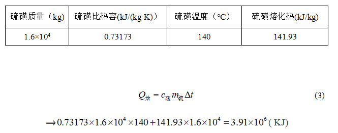 熱量是指系統(tǒng)在熱力學(xué)過程中由于溫度差而傳遞的能量。而硫磺燃燒反應(yīng)過程中不同溫度條件下涉及到多個(gè)熱量傳遞的過程。查表可得硫磺在140℃時(shí)的比熱容為0.73173 kJ/kg·K,根據(jù)已知參數(shù),利用熱量公式Q=cm△t計(jì)算得出硫磺在140℃時(shí)的總焓熱。(忽略壓力變化)